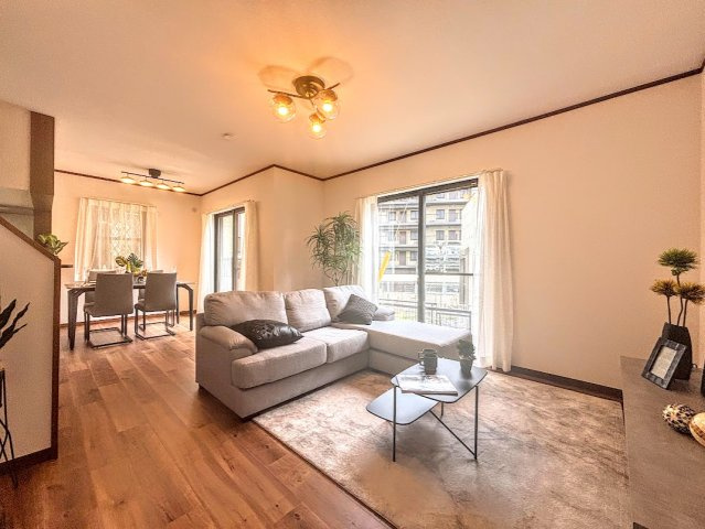 【居間・リビング】◆家族で食卓を囲むダイニングスペースと、ソファでゆったりくつろぐリビングスペースがしっかり区切られているので家具の配置や用途を使いわけしやすいです。